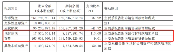 上圖為惠發(fā)食品公布的部分報(bào)表項(xiàng)目,從中可以看到,預(yù)付款項(xiàng)增幅較大,為113.08%。惠發(fā)食品解釋,這是因?yàn)閳?bào)告期內(nèi)預(yù)付材料款增加所致。