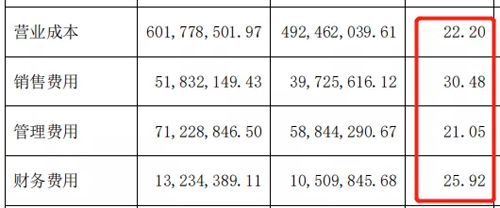 此外,報(bào)告期內(nèi),惠發(fā)食品的營(yíng)業(yè)成本、銷售費(fèi)用、管理費(fèi)用、財(cái)務(wù)費(fèi)用增幅都比較大,都在20%-30%之間。