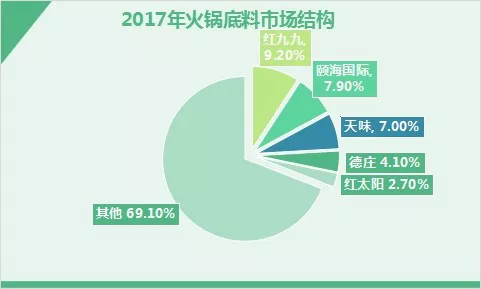 2017年,中國調(diào)料的市場規(guī)模大致在4100億元,其中復(fù)合調(diào)料約為980億,占行業(yè)的24%左右。而在復(fù)合調(diào)料中,火鍋大概占1/4,規(guī)模約為200億。
