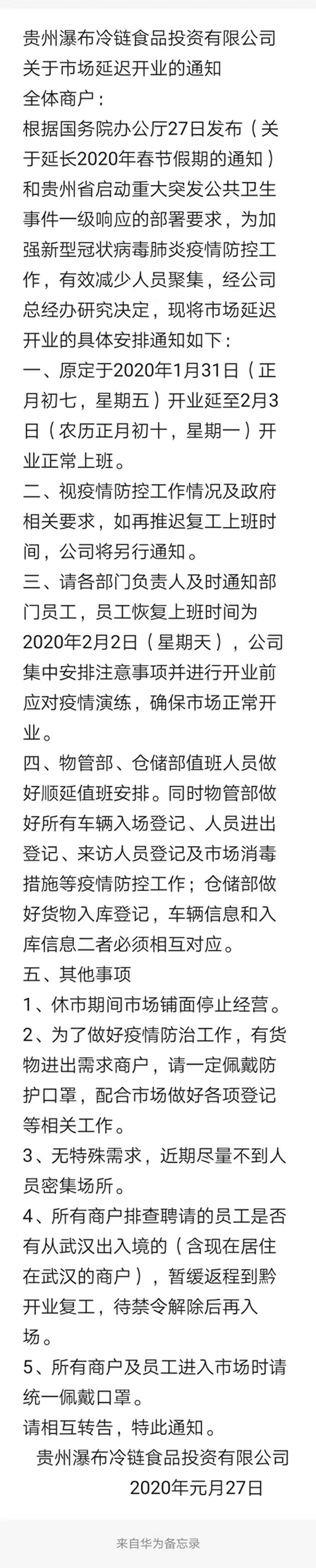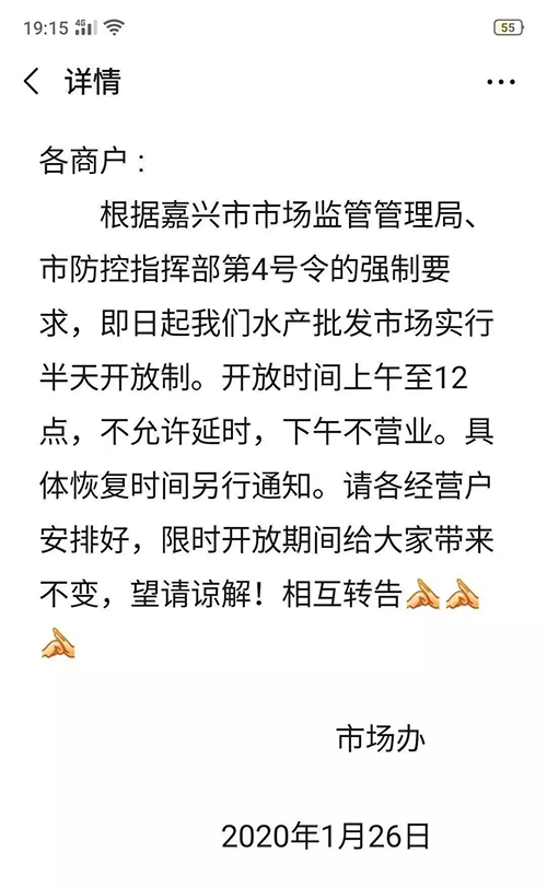 河南中原四季水產(chǎn)物流港也在昨天發(fā)布緊急通知,延期開市。