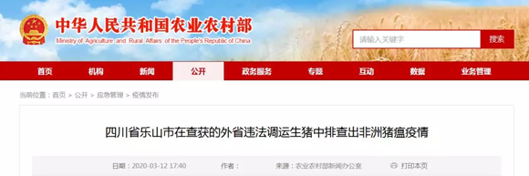 3月12日,農(nóng)業(yè)農(nóng)村部接到中國動物疫病預(yù)防控制中心報告,經(jīng)四川省動物疫病預(yù)防控制中心確診,在樂山市五通橋區(qū)冠英鎮(zhèn)查獲的一輛來自外省的生豬運輸車中,排查出非洲豬瘟疫情。查獲時,該車輛共載有生豬111頭,死亡7頭。