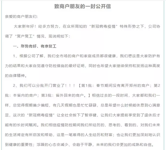 3月8日下午,河南增益信基供應(yīng)鏈有限公司官微發(fā)布《致商戶朋友的一封公開(kāi)信》。文中表示,在信基總公司的領(lǐng)導(dǎo)下,市場(chǎng)將分批開(kāi)門營(yíng)業(yè):