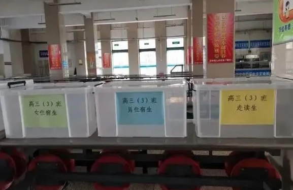 鄭州九中將各班的一日三餐都分成走讀生、男、女住校生三部分,用收納箱提前裝好。