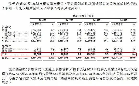 招股書稱,B2C業(yè)務(wù)的加入能夠減輕與大型商業(yè)客戶議價(jià)能力的劣勢,并有助于提高雞肉生產(chǎn)商的利潤。深加工雞肉制品的主要銷售和分銷渠道包括在線電子商務(wù)平臺(tái)和線下渠道,如超市、便利店以及特產(chǎn)店。