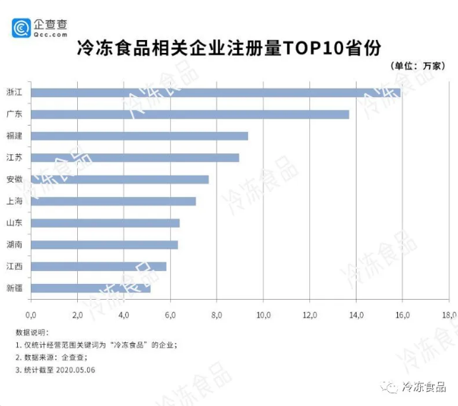 而在企查查數(shù)據上,TOP 10河南竟然沒有上榜,分析原因可能是企查查統(tǒng)計了經營范圍關鍵詞為“冷凍食品”的企業(yè),浙江、廣東、福建排前三,應該是將冷凍水產品、果蔬計算在內。