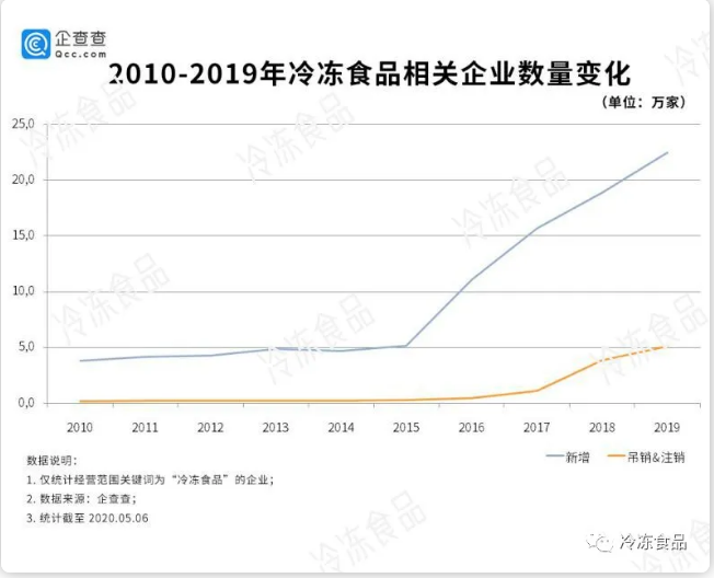從企查查截取的“2010—2019年冷凍食品相關企業(yè)數(shù)量變化”中,可以看出,這十年來: