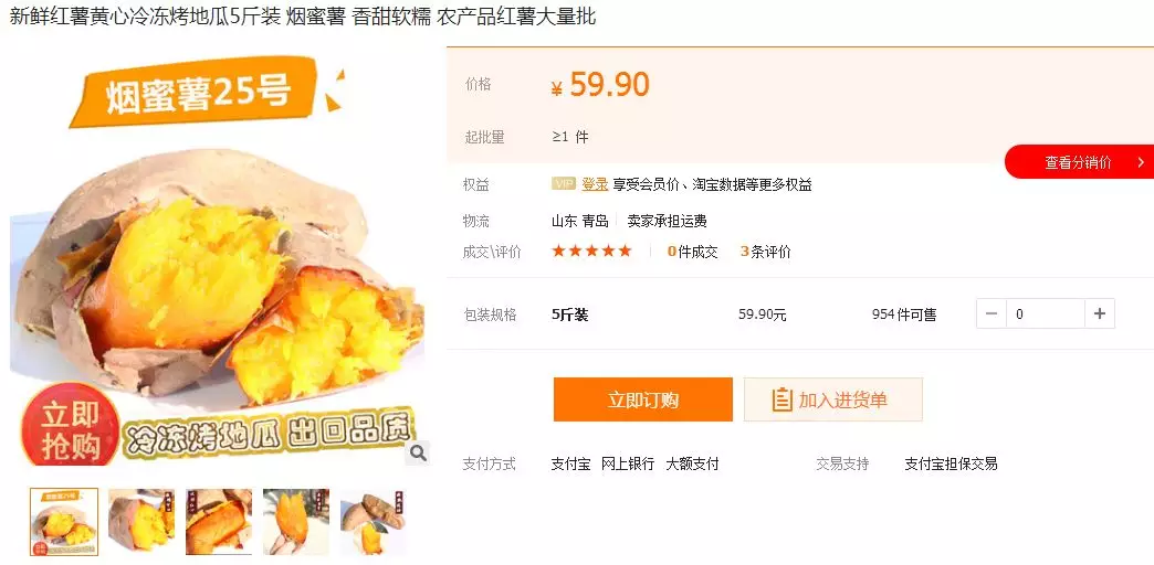 ▲金葉食品5斤裝冷凍烤薯阿里巴巴售價