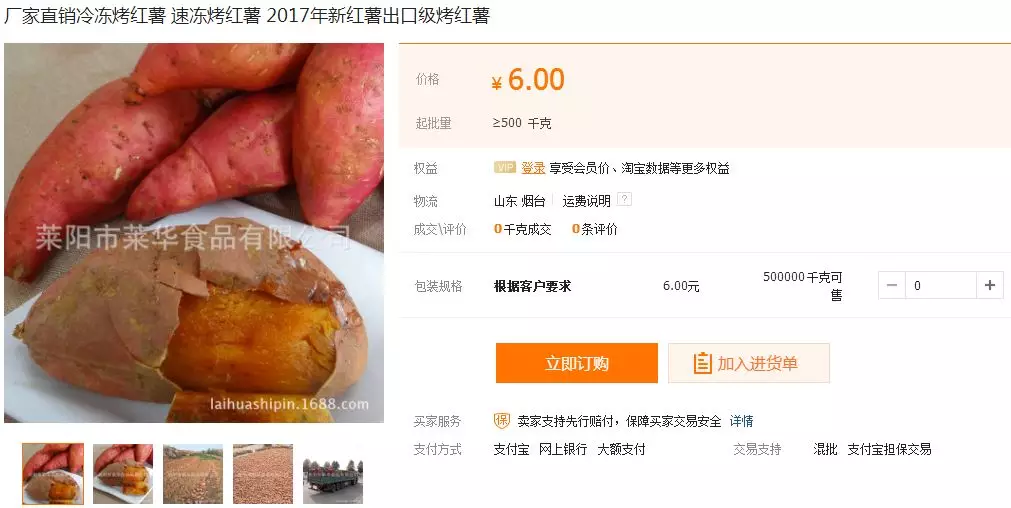 ▲萊華食品冷凍烤薯500公斤起批,阿里巴巴售價