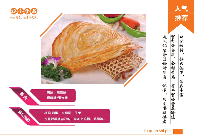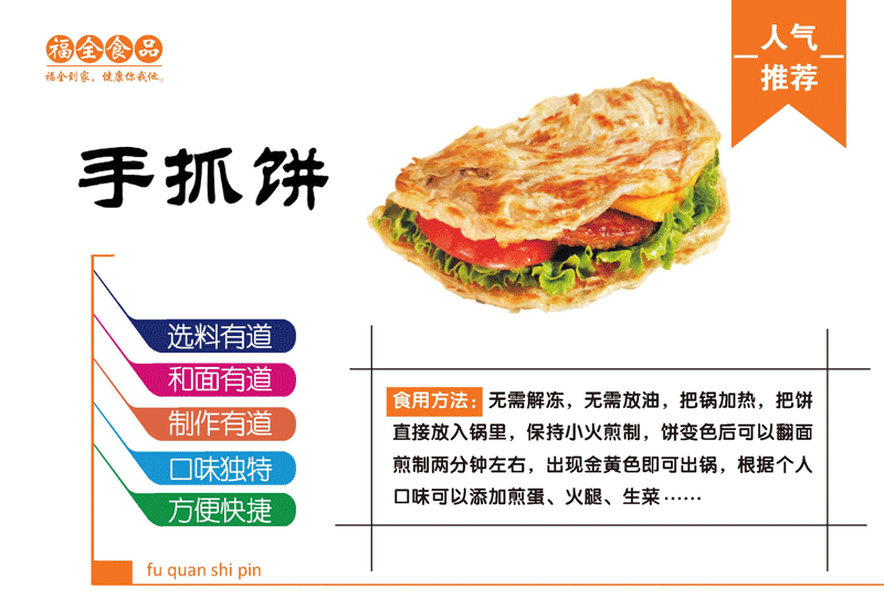 隨著人們收入的不斷增加,為滿足廣大居民提高生活質(zhì)量的要求,在2013年首家引進的臺灣風味手抓餅生產(chǎn)線,向市場傾情推岀李福全手抓餅,填補河北省速凍餅的空白。手抓餅“外焦里嫩,手抓如絲,筋道可口,安全快捷”被譽為“健康食品”。